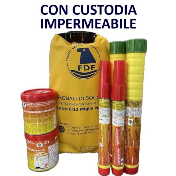 Kit segnali di soccorso entro 6-12-50 miglia e noleggio “Approvato Ministero dei Trasporti e della Navigazione”. In accordo con la “normativa SOLAS 83/96 certificato internazionale Marine Equipment”. Utilizzabili sia su naviglio Mercantile che da diporto DM n°387 del 29/9/99. Confezionati in robuste valigette in tessuto impermeabile e galleggianti per garantire uno stivaggio sicuro e duraturo.
