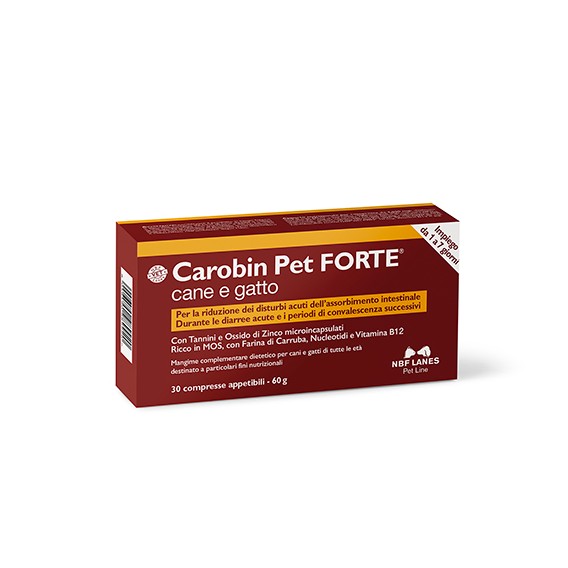 Carobin Pet Forte compresse appetibili è formulato con carboidrati altamente digeribili, Tannini e Ossido di zinco microincapsulati, Mannanoligosaccaridi (MOS), Farina di Carruba, Nucleotidi, Vitamina B12 ed un livello più elevato di elettroliti, per favorire la normale reintegrazione in seguito ad episodi diarroici.