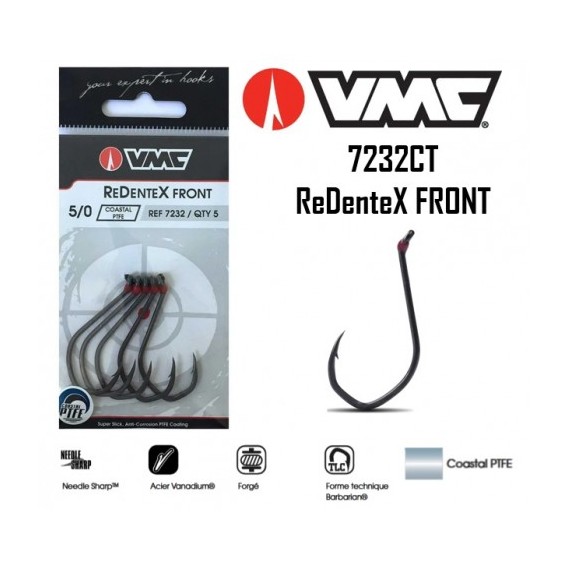 Il Redentex Front della VMC è un amo trainante per la traina con il vivo. La chiusura in resina dell'occhiello permette l'utilizzo di terminali più sottili senza il rischio di taglio (abrasione del filo sulla curva dell'occhiello), mentre la sua particolare inclinazione a 45°, permette di far scorrere l'amo sul terminale per una regolazione ottimale in base alla grandezza dell'esca. La forma "Technical Locking Curve" consente di ridurre il diametro del filo dell'amo, mantenendo un'eccezzionale resistenza all'apertura. Grazie all'utilizzo dell'acciaio "Vanadium" l'amo risulta più leggero, ultra resistente e con un'affilatura più durevole. Infine il rivestimento "Coastal PTFE" aumenta la velocità di penetrazione del 50% e resiste alla corrosione 5 volte più del classico PTFE.