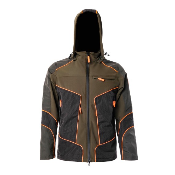 Giacca realizzata con tessuto softshell e applicazioni di tessuto tecnico a contrasto. Dotata di 4 tasche e un taschino sul davanti, tasca interna e carniere. Cappuccio staccabile.