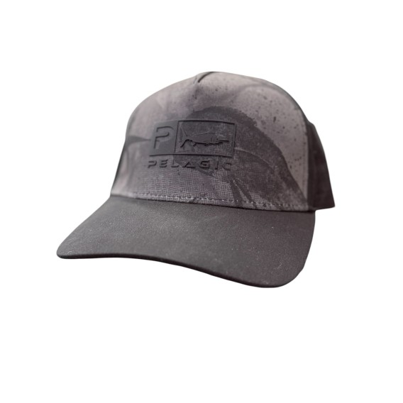 Sulla parte frontale del cappello è presente un logo in rilievo, di colore nero, che mostra la scritta "PELAGIC" e un'icona raffigurante una lampuga, insieme alla lettera "P" stilizzata. Il logo è stampato su un rettangolo leggermente rialzato rispetto al tessuto principale, donando un effetto tridimensionale.
