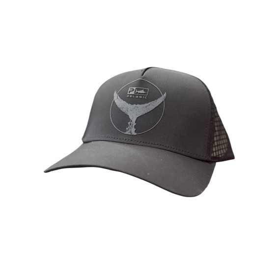 all'interno del cerchio, con il marchio "PELAGIC" nella parte superiore, accompagnato da un'icona che rappresenta un pesce. La stampa è in una tonalità grigiastra, che si distingue in modo discreto dallo sfondo nero del cappello.