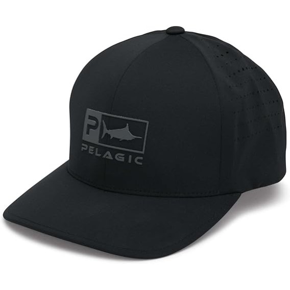 Logo: Il logo sulla parte frontale è composto da una lettera "P" stilizzata accanto a una sagoma di un marlin, con la scritta "PELAGIC" in maiuscolo sotto il logo. Il logo è in rilievo o stampato con un effetto opaco, che si distingue dal tessuto.