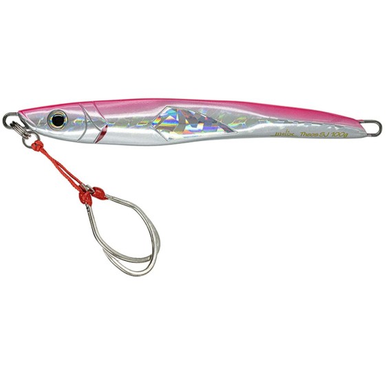 Molix Theos Shore Jig. Metal jig da shore jigging versatile, il Molix Theos è stato concepito per essere un jig  personalizzabile nel recupero grazie alla sua forma ed alla distribuzione del peso. Realizzato in materiale Zincalloy, con un peso specifico ridotto rispetto al classico piombo, con una maggiore mobilità ed un superiore effetto flashing in fase di caduta. Il Molix Theos Shore jig è un metal jig caratterizzato da "sbandate" ampie e irregolari, che lo rendono maggiormente adescante. Ottima esca per la pesca di dentici, cernie e ricciole, tunnidi (palamite, alletterati, tonni) anche da grandi distanze. Il Theos Shore Jigging è stato equipaggiato con doppio assist hook