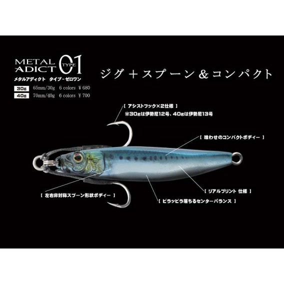 METAL ADICT 01 30GR DI CASA LITTLE JACK, AZIENDA GIAPPONESE LEADER NEL SETTORE DELLA PROGETTAZIONE E COSTRUZIONE DI ESCHE ARTIFICIALI DI ALTISSIMA QUALITA'. IN PARTICOLARE QUESTO METAL-JIG NASCE PER LA PESCA A LIGHT-SPINNING IDEALE PER LA RICERCA DI SVARIATI PREDATORI MARINI E NON SOLO. HA DATO MOLTI RISCONTRI POSITIVI SU AGUGLIE, OCCHIATE, SARAGHI MA ANCHE LAMPUGHE TONNETTI ALLETERATI E MOLTI ALTRI.