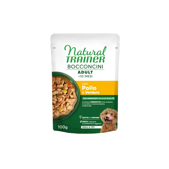 La ricetta a base di carne e pesce di alta qualità fornisce al tuo amico di zampa preziose proteine animali. Il menè è poi arricchito da deliziose verdure ricche di micronutrienti, come piselli e carote, nonché da componenti prebiotici che possono favorire la naturale funzionalità digestiva. Natural Trainer Bocconcini Adult Small & Toy in Salsa non contiene coloranti né conservanti artificiali.