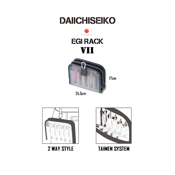 La Egi Rack VII della Daiichi Seiko è una doppia custodia portatotanare prodotta con i migliori materiali Made in Japan. L'unica custodia portatotanare sul mercato ad essere doppia: due custodie in una con 2 cerniere separate. Può contenere fino a 10 totanare, della misura massima di 4.0, per scomparto per un totale di 20 totanare. Può essere sia posizionata all'interno di un marsupio, sia utilizzata indipendentemente; infatti viene fornita con un pratico moschettone che potrà essere inserito in 3 posizioni differenti a piacimento del pescatore. La custodia è trasparente così da poter facilmente riconoscere ciò che si trova al suo interno.