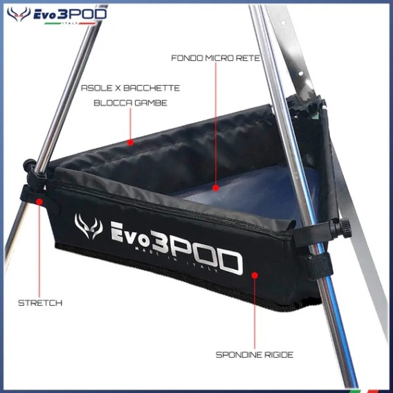 Inoltre l’originale Serbidora Triangolare Evo3POD è dotata di 3 asole superiori perimetrali studiate per adattarsi ai braccetti lunghi in alluminio del blocca gambe Creando un unico Doppio Accessorio: Blocca Gambe Stabilizzatore con serbidora incorporato.