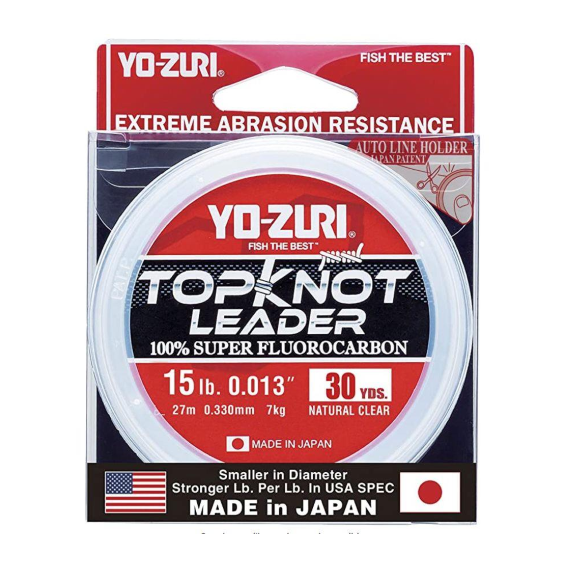 Il nuovo monofilo TopKonot Leader 100% Super Fluorocarbon di casa Yo-Zuri è un prodotto made in Japan dalla caratteristiche eccezionali. Alta resistenza all'abrasione e la sua lavorazione garantisce al filo di mantenere inalterato il suo colore anche dopo molte pescate. La carratteristica principale è il rapporto diametro tenuta.
