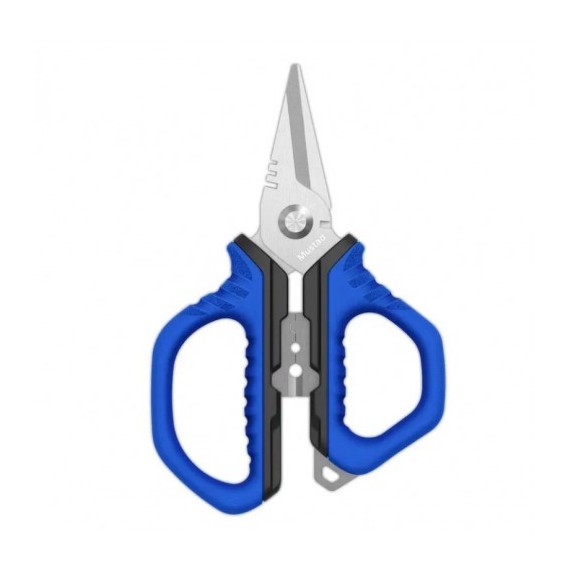 La forma della lama suggerisce che queste forbici possano essere utilizzate per tagliare fili, lenze da pesca o persino piccoli metalli.