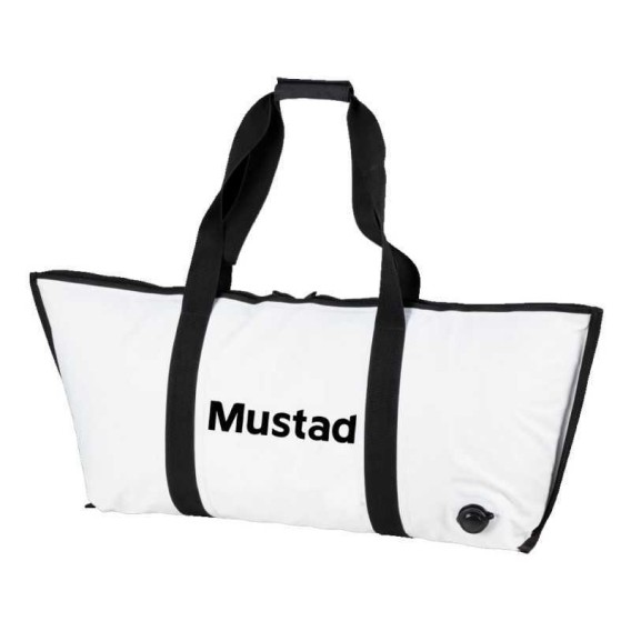 L'immagine mostra una borsa di colore bianco con dettagli neri, tra cui le cinghie e la bordatura. Sulla parte anteriore è stampato il marchio "Mustad". La borsa ha una forma ampia e allungata, probabilmente progettata per il trasporto di pesci o altri oggetti ingombranti. In basso a destra è presente una valvola di scarico, che suggerisce che la borsa potrebbe essere una "kill bag" o una borsa termica utilizzata nella pesca per mantenere il pescato fresco.