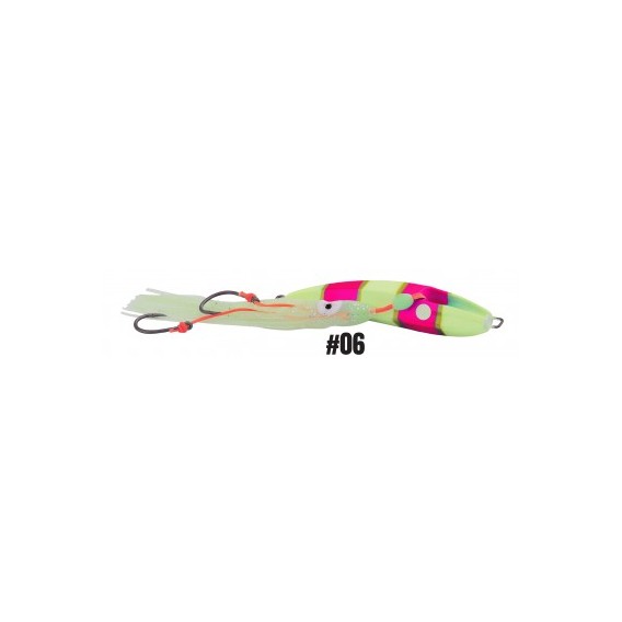 Inchiku dall'azione di nuoto estremamente accattivante, disponibile in diversi pesi e colori che si adattano ad ogni situazione. Alcune parti del corpo, i due occhi e il polpo sono fluorescenti, tanto da risultare particolarmente attraenti e facilmente visibili ai pesci anche a grandi profondità. Intrecciati e ami di prima qualità per forzare pesci di grossa taglia in totale sicurezza.