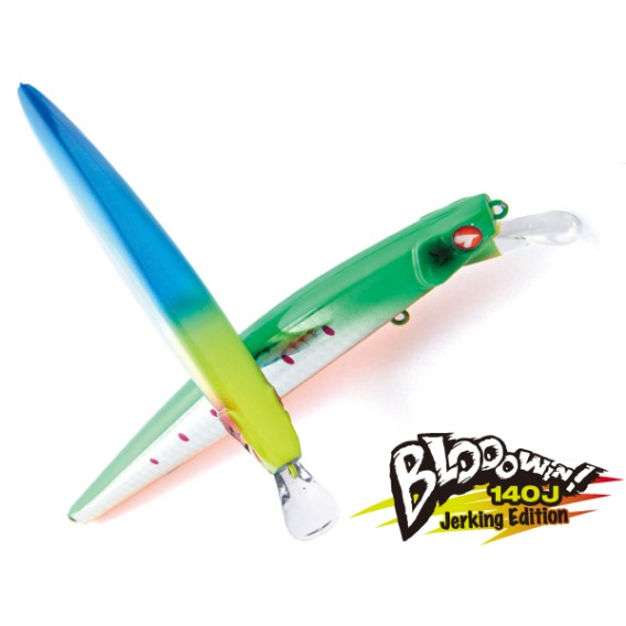 Il Blooowin! 140J Jerking Edition della Blue Blue è l'evoluzione del celebre 140S, progettato specificamente per il jerking. Grazie all'aumento di peso di 3 g, la distanza di lancio aumenta notevolmente, in modo da raggiungere anche le zone più lontane, mentre l'affondamento rapido consente di arrivare rapidamente nello strato desiderato, consentendo di affrontare anche le profondità che prima erano complicate (ad esempio, con PE1 affonda circa 7 m in 10 secondi). In pratica, è posisbile coprire ampie aree e attirare i pesci con un'azione di jerk estremamente efficace a profondità maggiori. Questo modello mantiene l'azione da jerk distintiva del 140S originale, ma aggiunge la possibilità di raggiungere facilmente punti normalmente difficili come la pesca dalla spiaggia, dalla scogliera e dai porti, ma anche dalla barca, rendendo ogni lancio più redditizio. Il design è studiato per offrire facilità d'uso senza paragoni! Tuttavia, l'azione risulta più efficace se eseguita con jerkate continue, e non con un semplice recupero lineare.