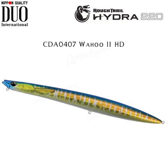 Il Rough Trail Hydra 220 della DUO è un nuovo needle che imita perfettamente il movimento di un'Aguglia! L'Hydra è esattamente un "sinking pencil", quindi un esca senza paletta con azione affondante quando l'esca viene lasciata ferma o viene stoppato il recupero. Il design del corpo risulta essere allungato, così da evitare che la preda possa mordere lo shock leader. Utilizzabile sia dalla riva che dalla barca, l'Hydra produrra un movimento sulla superficie stile "wtd" nel caso in cui venga jerkato, mente se recuperato velocemente produrrà un movimento scodinzolante sempre sulla superficie. Molto semplice da utilizzare e da lanciare anche con attrezzatura pesante alla ricerca di grossi predatori!