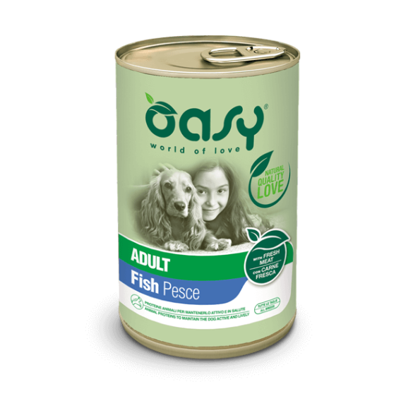 Mantieni il tuo cane adulto attivo e in salute con gli alimenti umidi Oasy. Il morbido paté gusto pesce include proteine animali di alta qualità ed è adatto a cani di tutte le taglie. La carne fresca garantisce digeribilità, assimilazione dei nutrienti e gusto.