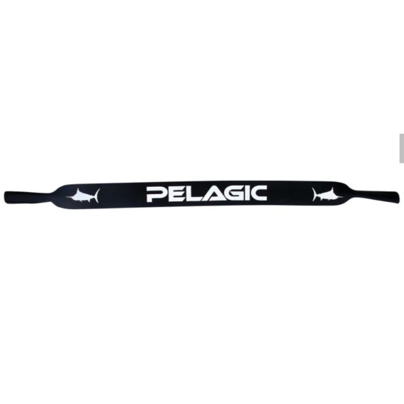 fascia nera in neoprene con il logo "PELAGIC" stampato in bianco al centro. Ai lati del testo sono presenti due sagome stilizzate di pesci marlin, anch'esse di colore bianco.