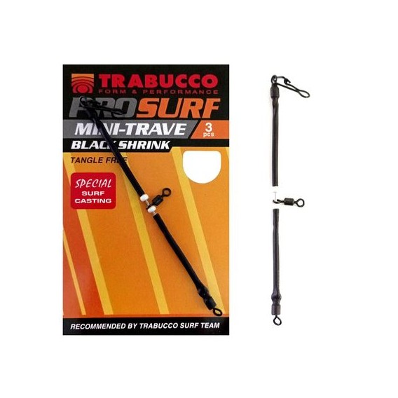 Mini trave Trabucco Black Shrink Termosaldante, estremamente robuste in acciaio, fornite di girella e rivestite con guaina termosaldante per un consolidamento extra. Si dimostrano estremamente comode per il surf casting, il beach ledgering.