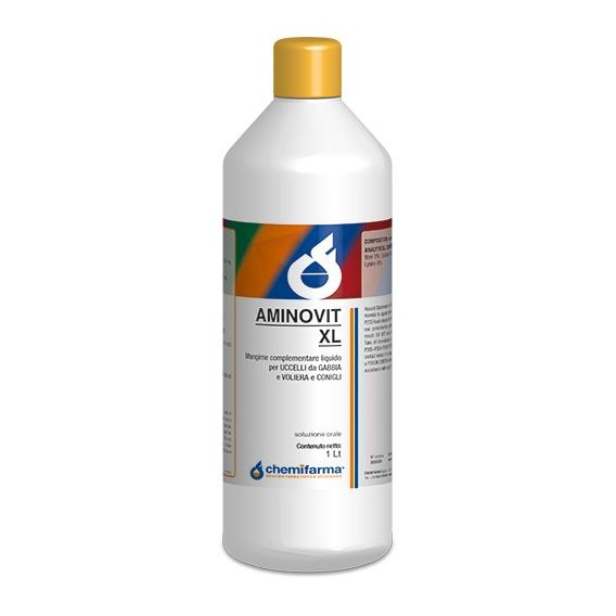 AMINOVIT XL è una soluzione liquida da 1 litro prodotta da Chemifarma, formulata per supportare il benessere di uccelli e colombi attraverso un apporto bilanciato di vitamine e aminoacidi essenziali.